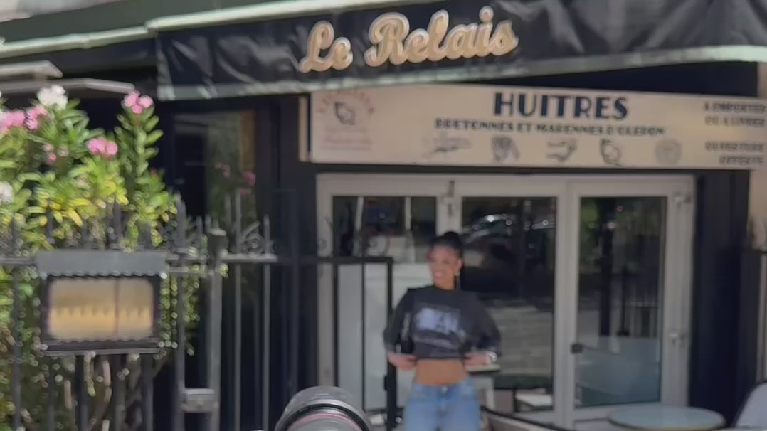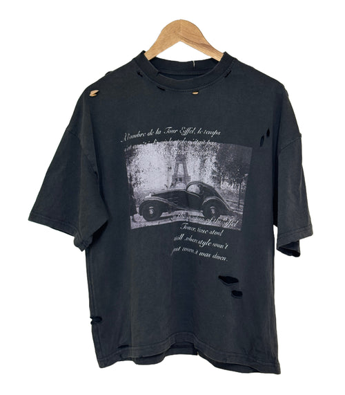 Oversized black T-shirt with a washed vintage finish. Features a monochrome Paris-inspired graphic with script detailing for a clean, elevated streetwear look.